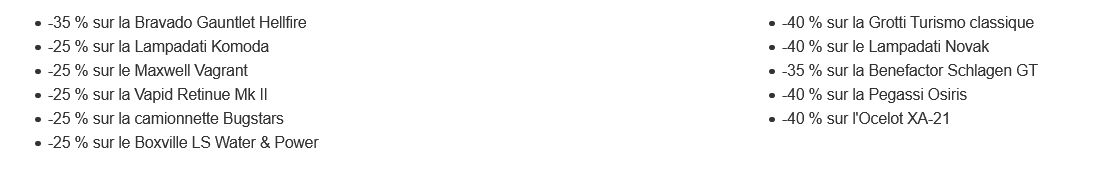 qui permettent de lancer les missions. De nombreux véhicules sont également à prix réduits cette semaine.