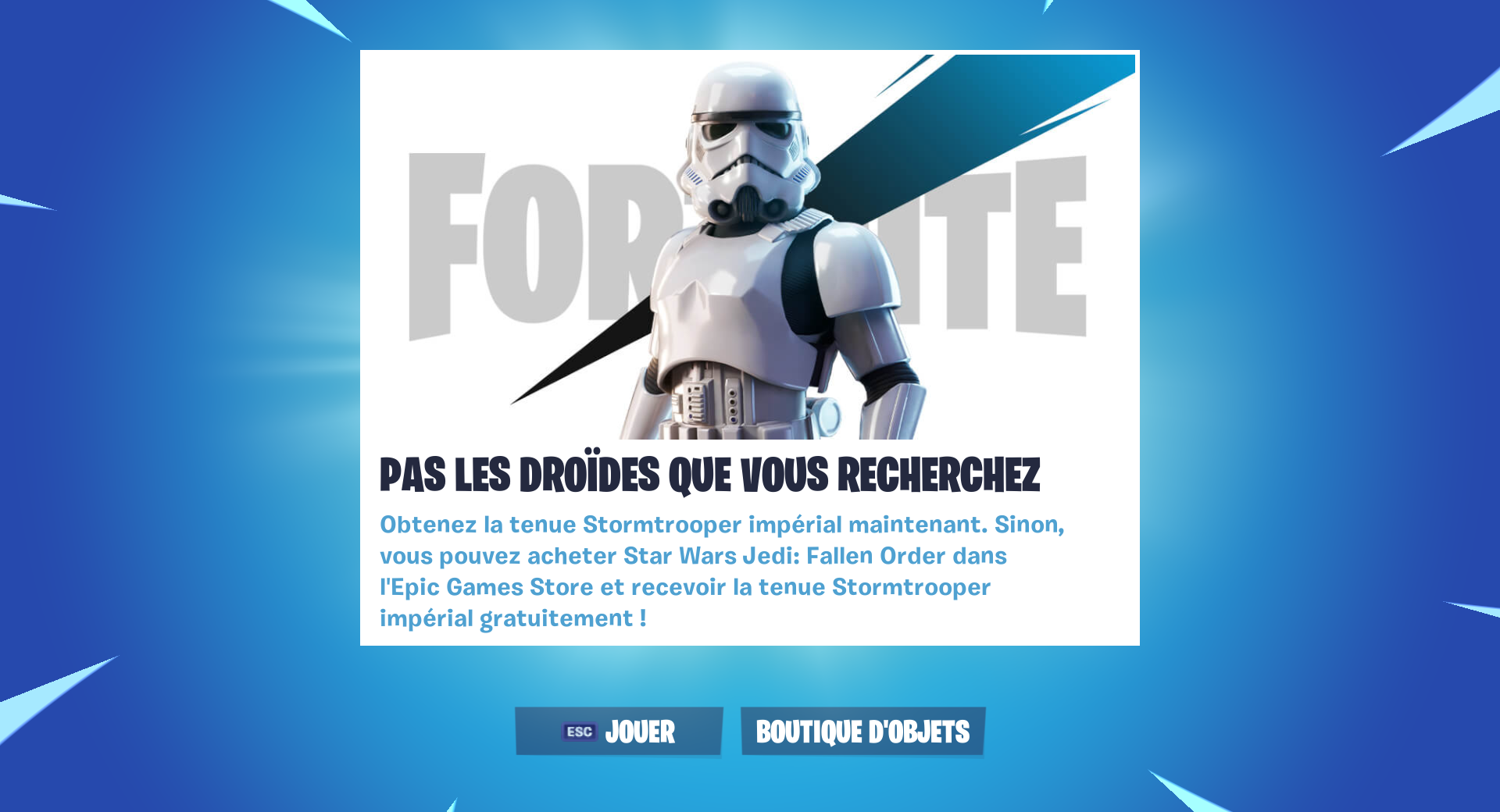 Vous avez jusqu’au 30 novembre 2020, donc plus d’un an, pour obtenir gratuitement le skin ! Si vous ne souhaitez pas acquérir le jeu, vous avez toujours la possibilité d’acheter le Stormtrooper