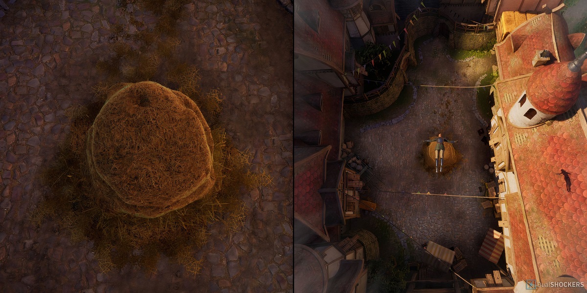 chapitre Brave Knights, tu effectues un saut acrobatique depuis un toit pour atterrir dans une botte de foin, comme dans les célèbres sauts de foi de la