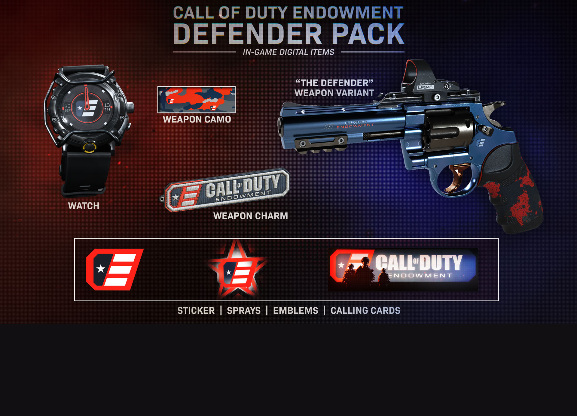 Ce pack contient une variante d’arme pour pistolet, nommée Le défenseur et qui inclut une lunette et un réticule thématiques personnalisés, un camouflage d’arme, une montre,