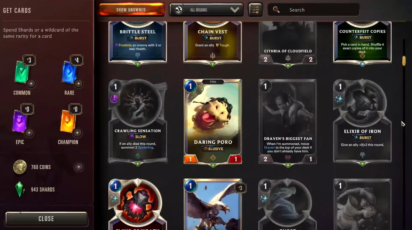 Comme sur les autres jeux de cartes, il existe 4 niveaux de raretés pour les cartes, du moins cher au plus cher : Commune, rare, épique et enfin les champions.