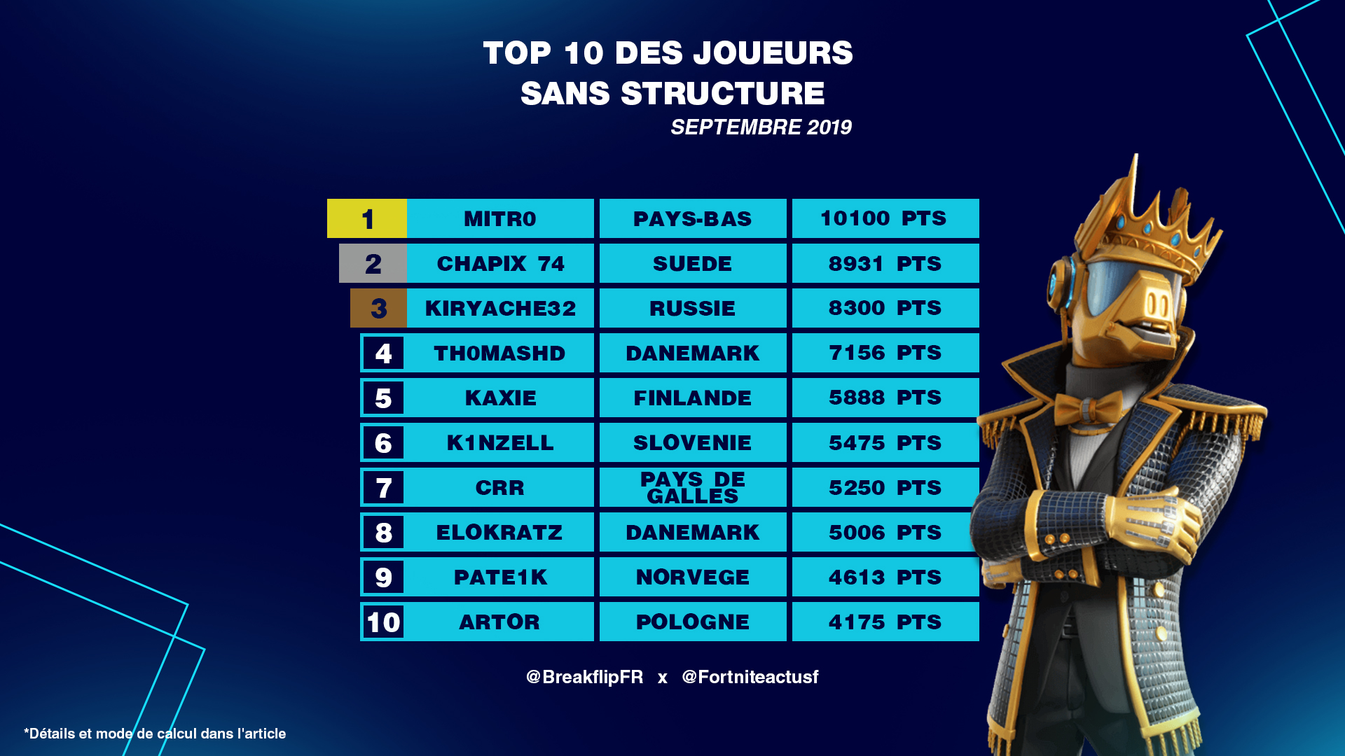 basé uniquement sur les tournois officiels Epic Games du mois de septembre (Cash Cup, FCS).