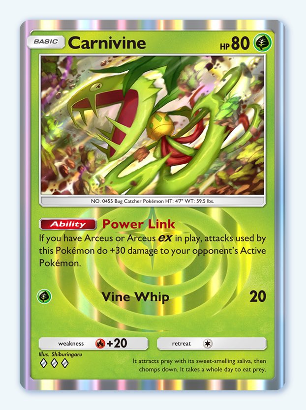 Power Link : Si vous possédez un Arceus ou Arceus ex, l’attaque de ce Pokémon inflige +30 dégâts. De même, il s’agit d’un très bon T1 dans un deck Plante avec Arceus.