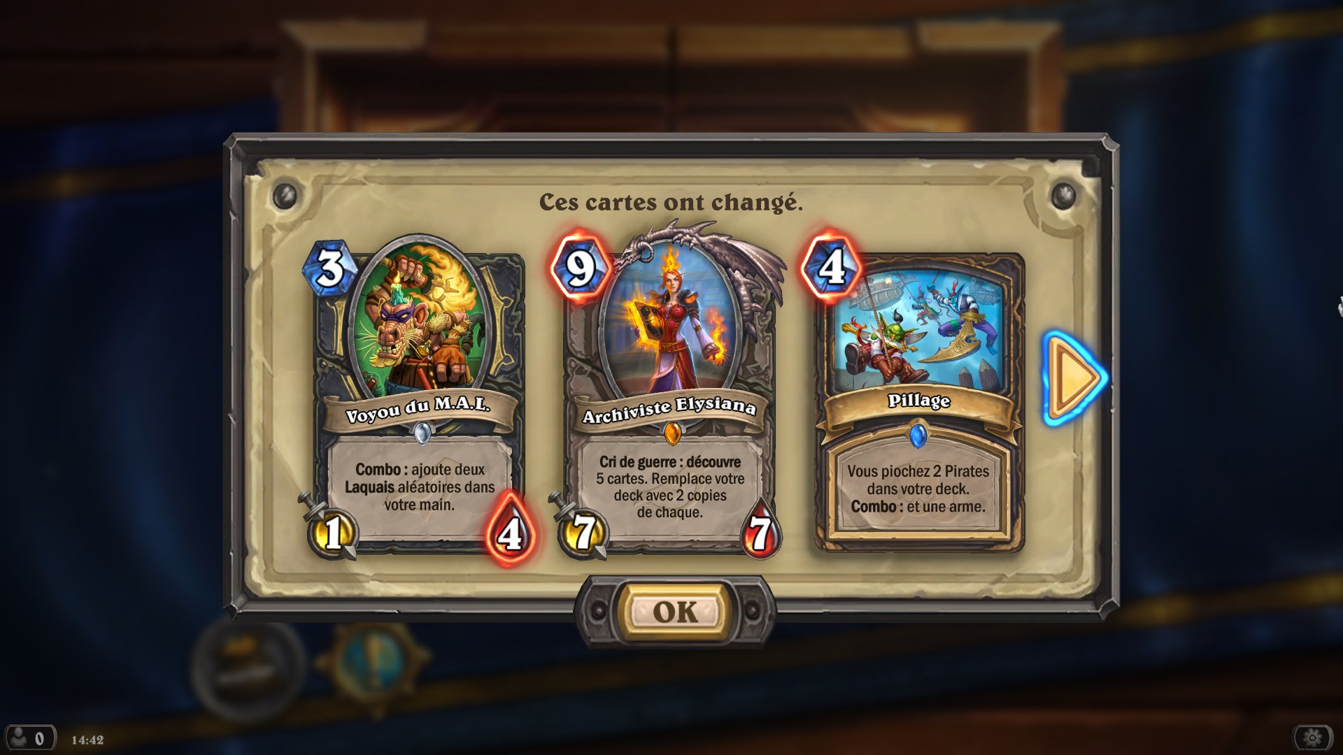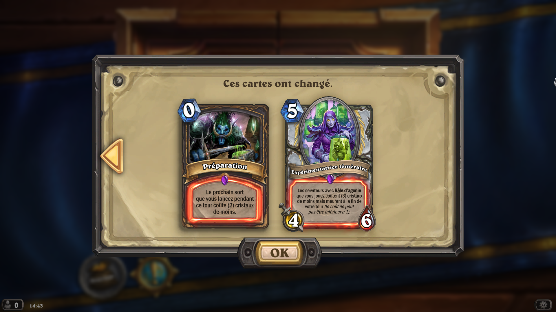 ligne quelques modifications sur certaines cartes. Elles concernent notamment les points de vie, le coût en mana ou encore l’effet des cartes. Voleur et Prêtre étant les classes principalement