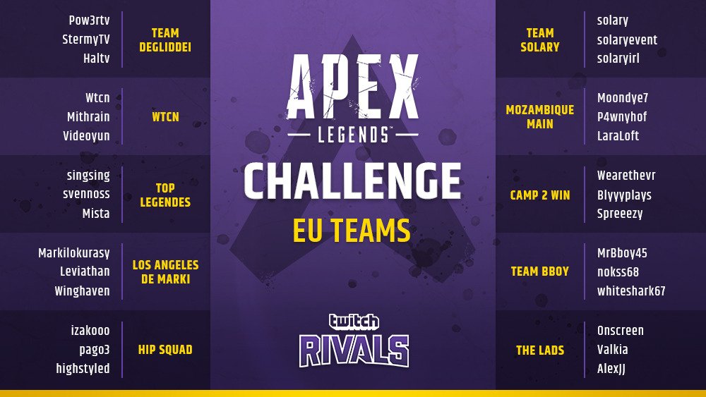 Le Twitch Rivals Apex Legends Challenge sera une compétition en deux parties (sur deux jours) organisée sur deux régions : en Europe et en Amérique du nord. Dans chaque région on retrouvera