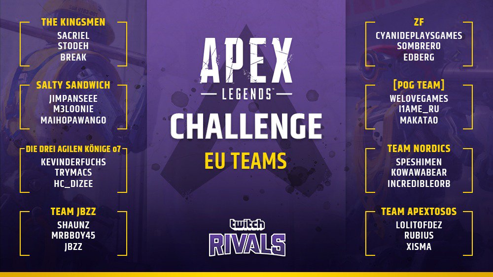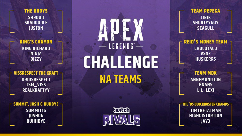 Depuis peu, on dispose de quelques noms qui participeront au Twitch Rivals sur Apex Legends. Pour rappel, chaque région verra s’opposer 16 équipes de 3 joueurs (48 en tout). Pour en savoir,