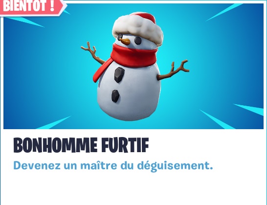 Prenez l’apparence d’un bonhomme de neige furtif, et cachez-vous sur la carte pour surprendre vos adversaire ! Comme les dataminings nous l’ont laissé penser, le bonhomme furtif débarque sur Fortnite, le nouveau buisson capable de