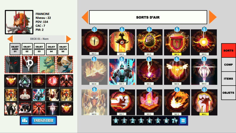 icônes hexagonales, les 8 sorts dans une liste à droite, l’arme en bas, accompagnée de son sort et ses 2 passifs, ainsi que votre personnage, avec son apparence tirée de votre arme