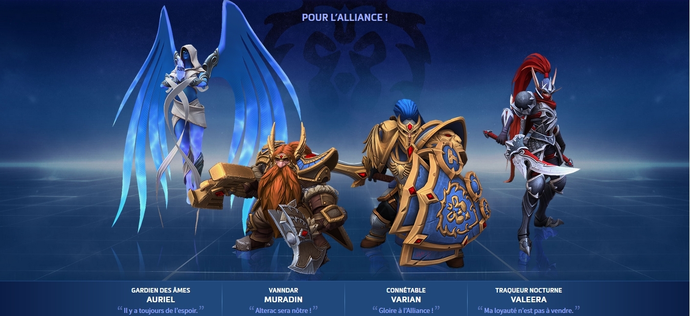 Dans l’ordre de gauche à droite : Gardien des âmes Auriel, Vanndar Muradin, Connétable Varian, Traqueur Nocturne Valeera.