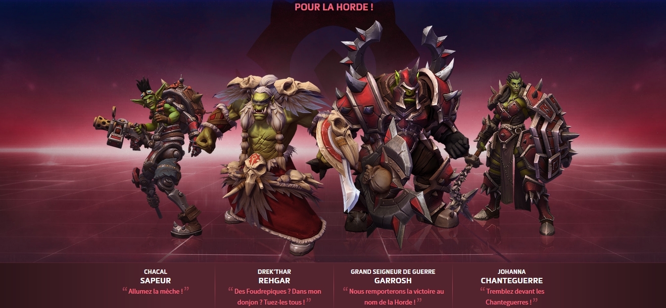 Dans l’ordre de gauche à droite : Chacal Sapeur, Drek’thar Rehgar, Grand seigneur de guerre Garrosh, Johanna Chanteguerre.