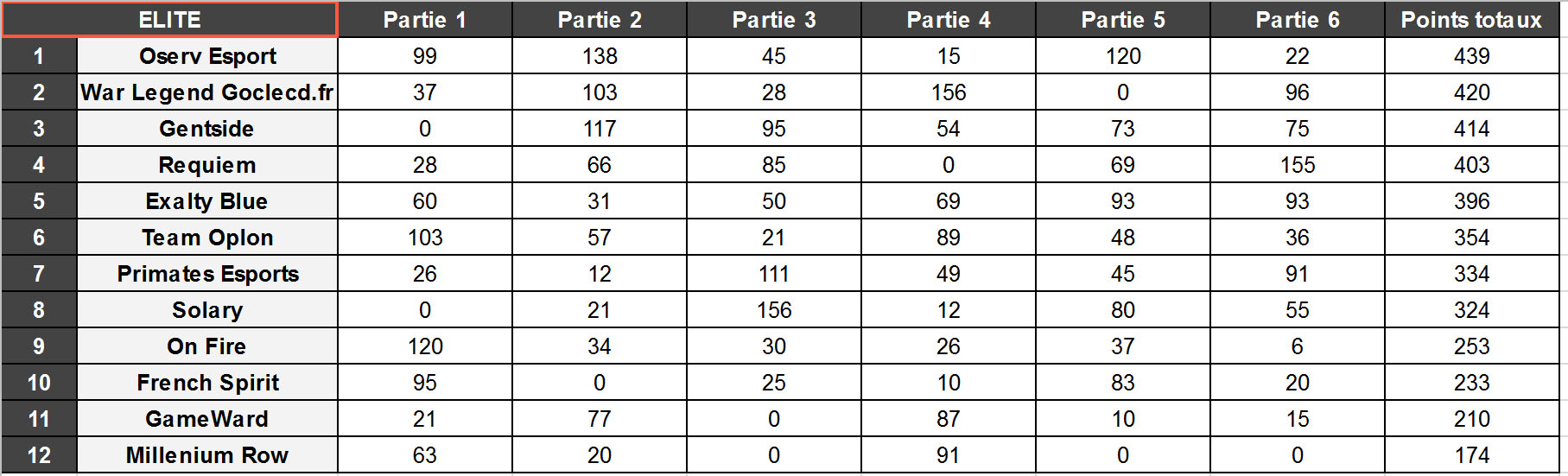 | French Spirit | Top 3 – 5 kills | Top 12 – 0 kill | Top 7 – 0 kills | Top 10 – 0 kill | Top 3 – 3 kills | Top 8 – 0 kill |