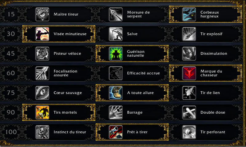 Mono-cible : Marque du chasseur > Visée > Précision > Tir des arcanes > Visée > Visée > Tir rapide > Corbeaux hargneux > Visée > Tir assuré > Tir des