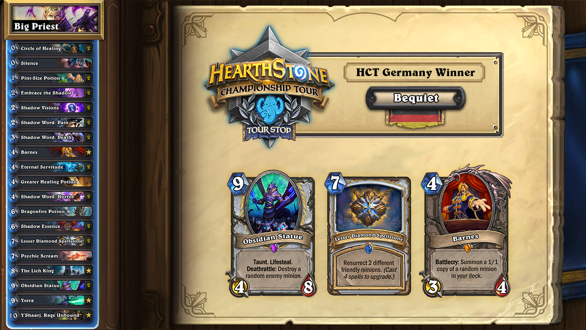 Decklist surprenante pour clore la lineup de Bequiet. Alors que la méta Mage actuelle semble plutôt être orientée vers le Mage Aluneth le joueur décide ici de partir sur une decklist late-game