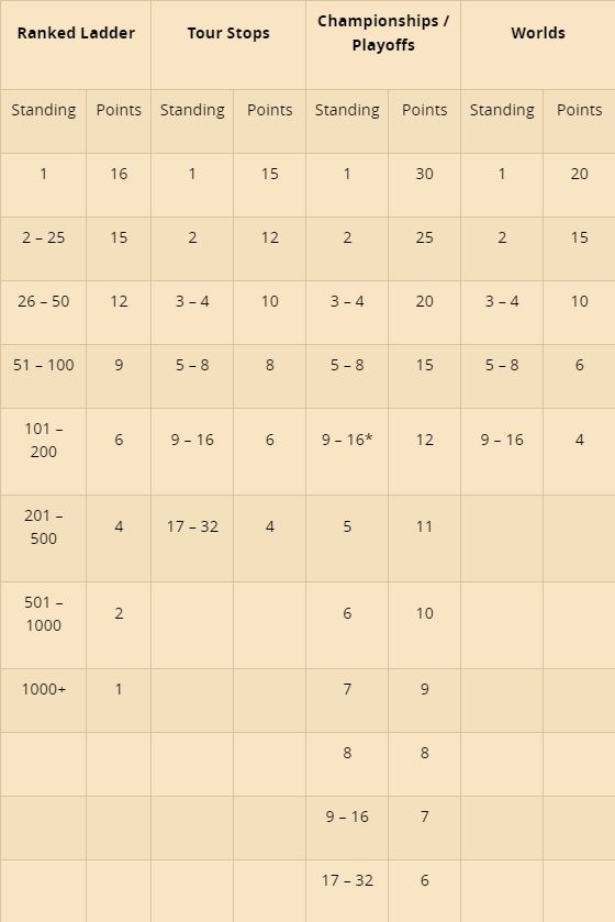 classement dans le ladder lors d’une saison HCT sera celui considéré pour le total de points. Blizzard souhaite ainsi ne pas désavantager les joueurs faisant des tournois en fin de saison lorsque