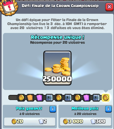 Comme vous pouvez le voir sur l’écran, la récompense ultime, à 20 victoires, est 250.000 d’or. Cela permet, entre autres, de monter deux cartes de votre choix au niveau maximum, tout en gardant une petite réserve.