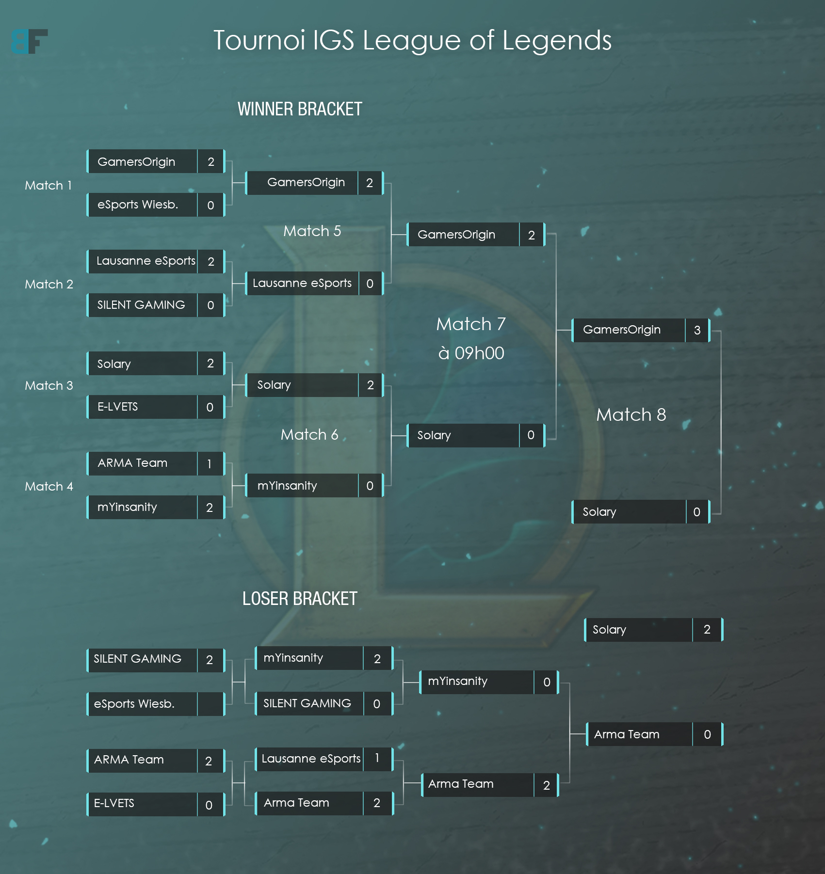 Les matchs se sont joués en Bo3, à l’exception de la grande finale, qui s’est jouée en Bo5. GamersOrigin s’est imposée, gagnant 3 422 € de cashprize, 1 711 € pour Solary et 855 €