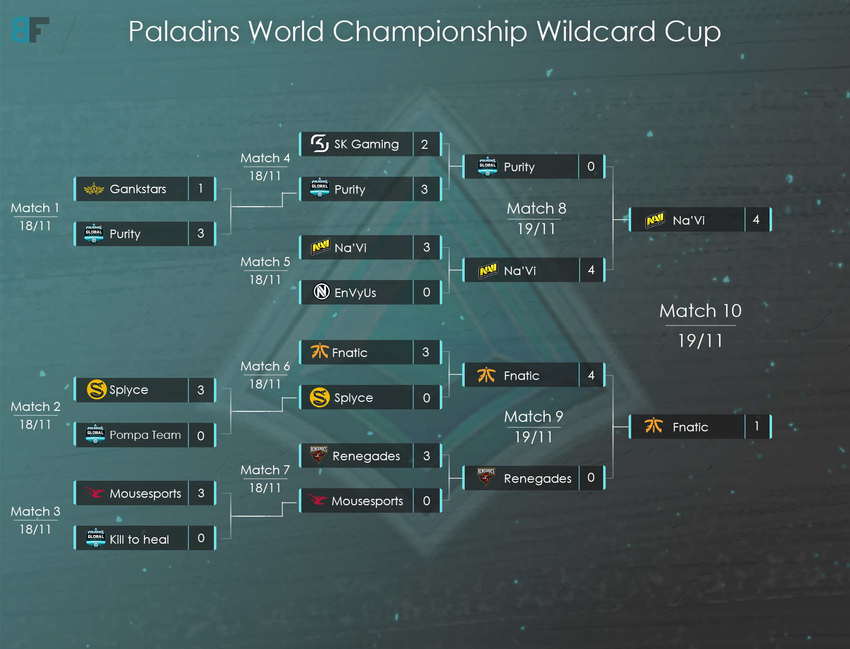 Worlds ainsi que les 2 meilleures équipes des Paladins Global Series EU & NA ; 11 équipes s’opposeront dans le bracket pour deux places aux Worlds avec un seed de Wildcard (les