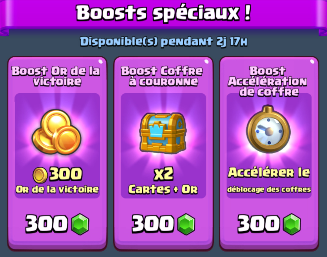 En effet, si vous payez 300 gemmes, vous avez droit à une amélioration de certaines composantes du jeu, pendant une semaine. De gauche à droite, cela fait 3.000 d’or
