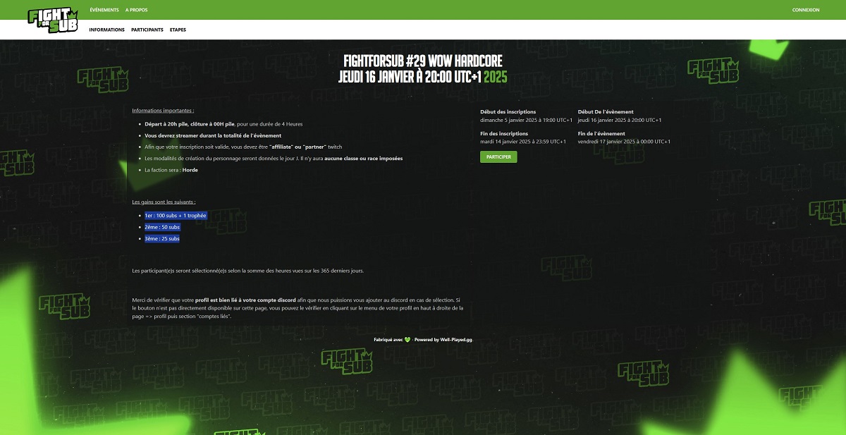 - Déroulement de l’événement : Le tournoi commence pile à 20h et se termine à 00h, soit 4 heures.