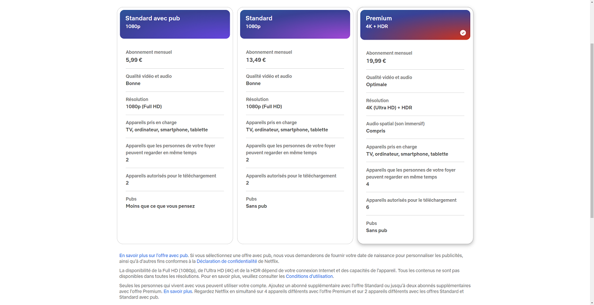 Pour la regarder de façon « légale » en streaming, il faudra donc débourser entre 5,99 € pour la version Standard avec Pub, en 1080p, Standard à 13,49 € sans pubs et Premium à