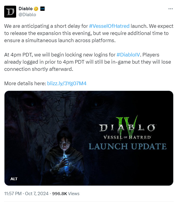 Initialement prévue à 1h du matin, l’ouverture des serveurs pour Vessel of Hatred a subi un retard de plusieurs heures. Blizzard a informé les joueurs d’un « problème technique », sans donner de