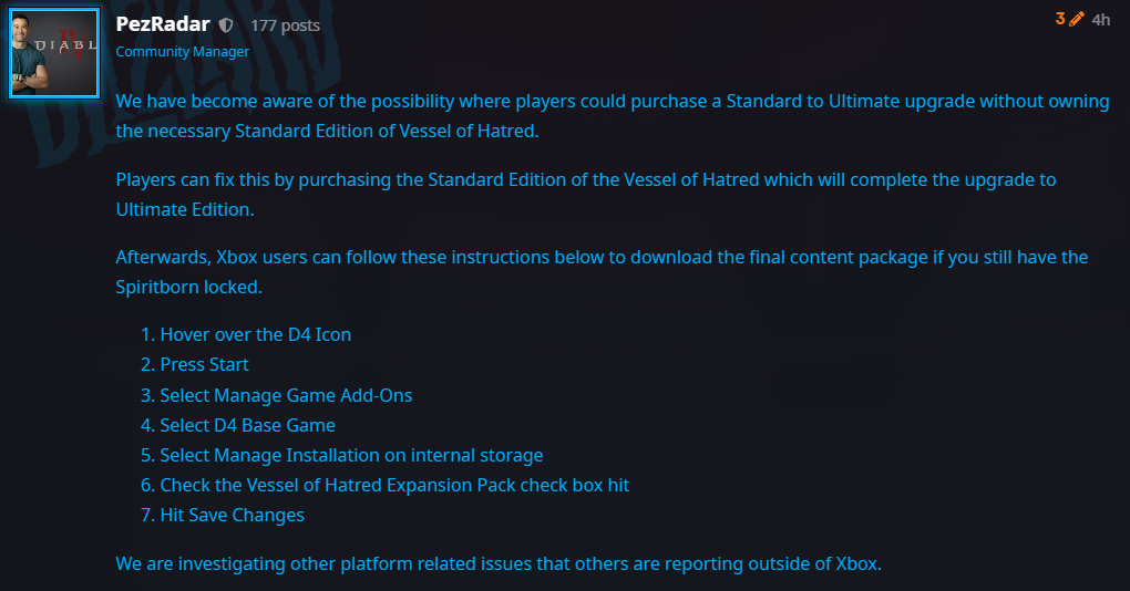Les joueurs Xbox rencontrant des problèmes avec le Sacresprit doivent vérifier si le pack d’extension a été téléchargé correctement. Pour ce faire, Blizzard conseille de vérifier les add-ons