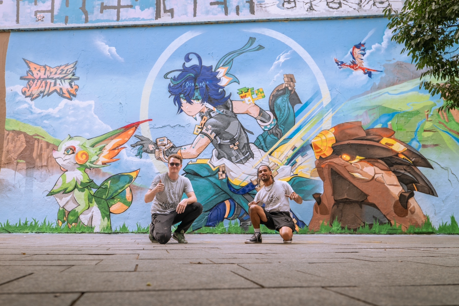 Mister Copy à gauche et onemax à droite, les deux artistes à l’origine des deux fresques sur Natlan à Paris pour la sortie de la région sur Genshin