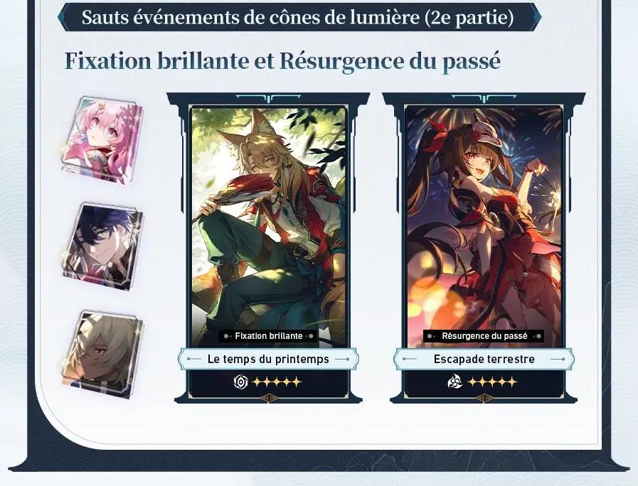 personnages 4 étoiles qui les accompagneront, ce seront Hook, Guinaifen et Arlan. Pour les cônes de lumière, vous pouvez consulter les visuels qui