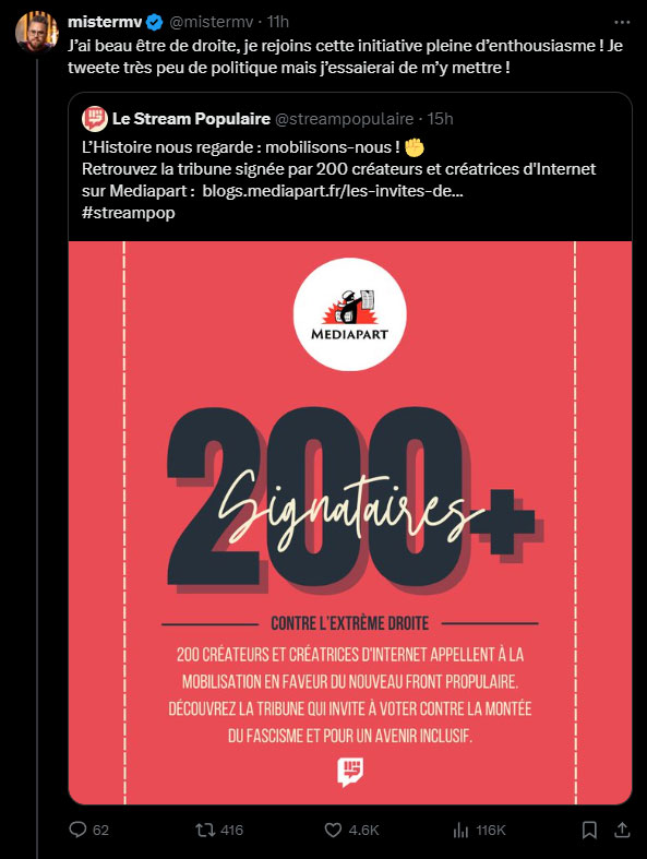 Face à cette situation, 200 personnalités d’internet, dont de nombreux streameurs et streameuses, ont signé une tribune publiée sur Mediapart, appelant à la mobilisation contre l’extrême droite.
