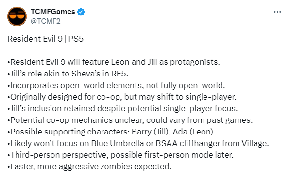 Une fuite donnant de possibles nombreux éléments sur le prochain jeu Resident Evil, Resident Evil 9 pourraient avoir fuité via le compte Twitter de TCMFGames.  Voici ce qui pourrait
