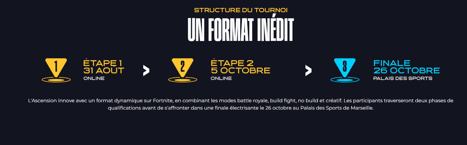 La phase finale de Fortnite Ascension se tiendra le 26 octobre 2024 au Palais des Sports de Marseille. Attendue avec impatience, elle rassemblera environ 6 000 spectateurs. Les 60 meilleurs