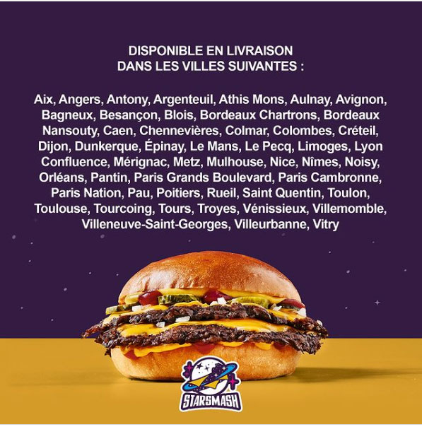 Les Burgers d’Amixem sont disponibles uniquement en livraison, Starsmash Burgers a fait son apparition dans 49 villes françaises, y compris Paris, Lyon, Bordeaux, et beaucoup