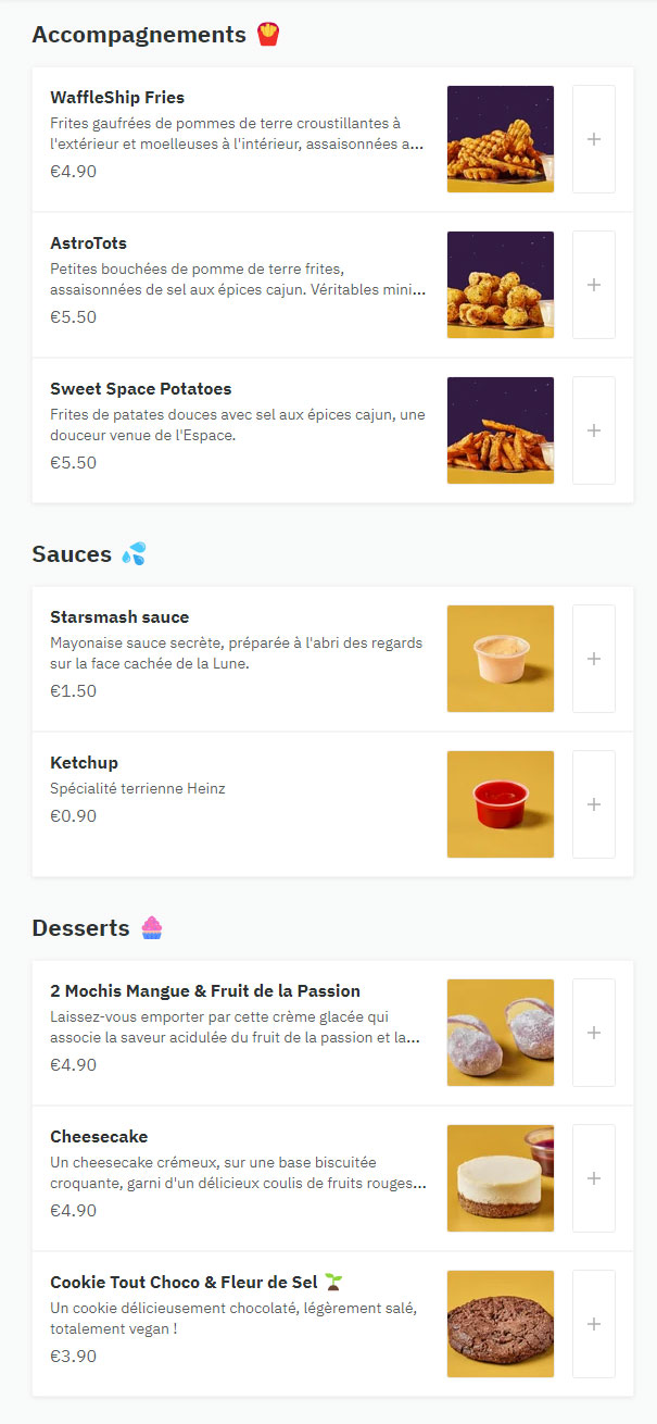 WaffleShip Fries, des AstroTots ou des Sweet Space Potatoes. Pour les gourmands, des desserts comme des mochis et des cookies sont aussi