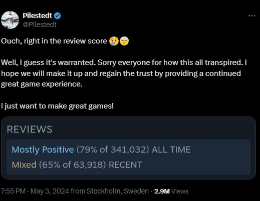 En moins de 48 heures, plus de 100 000 critiques négatives ont été publiées sur Steam, remettant en question la décision de Sony. Arrowhead, le développeur de Helldivers 2, a