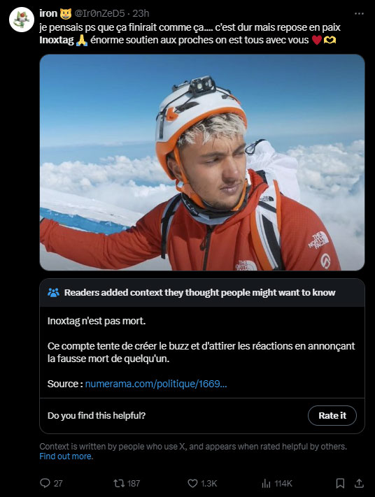d’Inox, mais qui s’inquiète également pour sa vie. Mais au-delà de son exploit personnel, c’est la vague de désinformation qui l’accompagne qui retient l’attention. Entre vidéos manipulées et TikToks