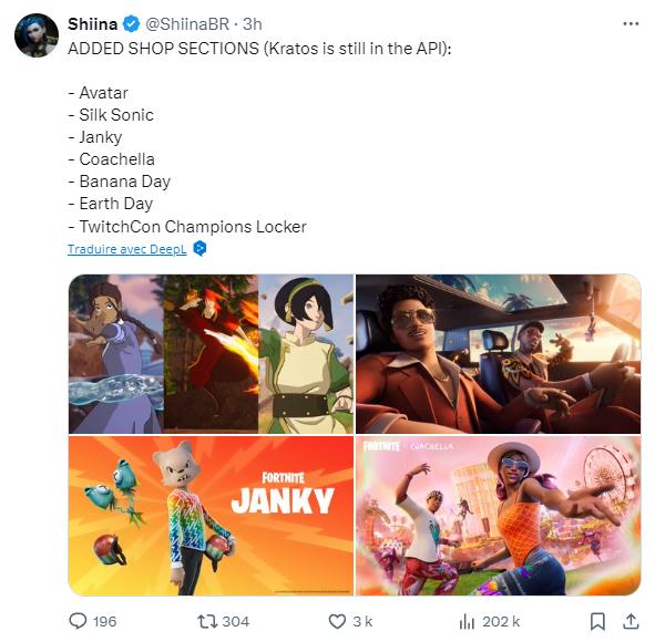 proposé dans les skins de la collab. D’autres skins sont aussi trouvables dans les fichiers du jeu avec une nouvelle collaboration avec Coachella ou bien encore celle avec God of War pour reproposer le skin Kratos avec d’autres