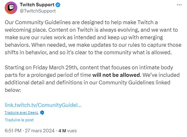 Afin de lutter contre ces dérives et pour proposer une plateforme accueillante pour tout le monde, le compte X officiel de Twitch Support a publié un message qui vise principalement le fait