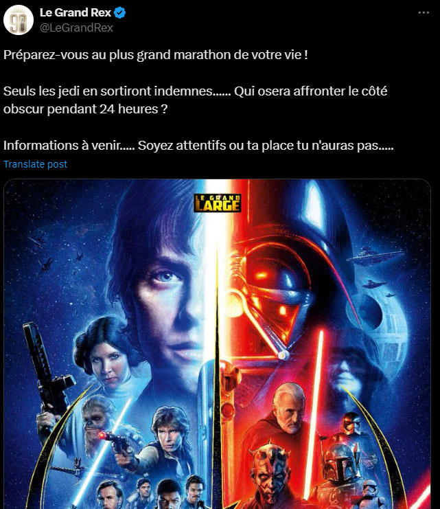 Le compte X du Grand Rex a dévoilé les prémices d’un événement sans précédent : un marathon de plus de 24 heures dédié à la saga Star Wars. Bien qu’il ne s’agisse de spéculation, on peut