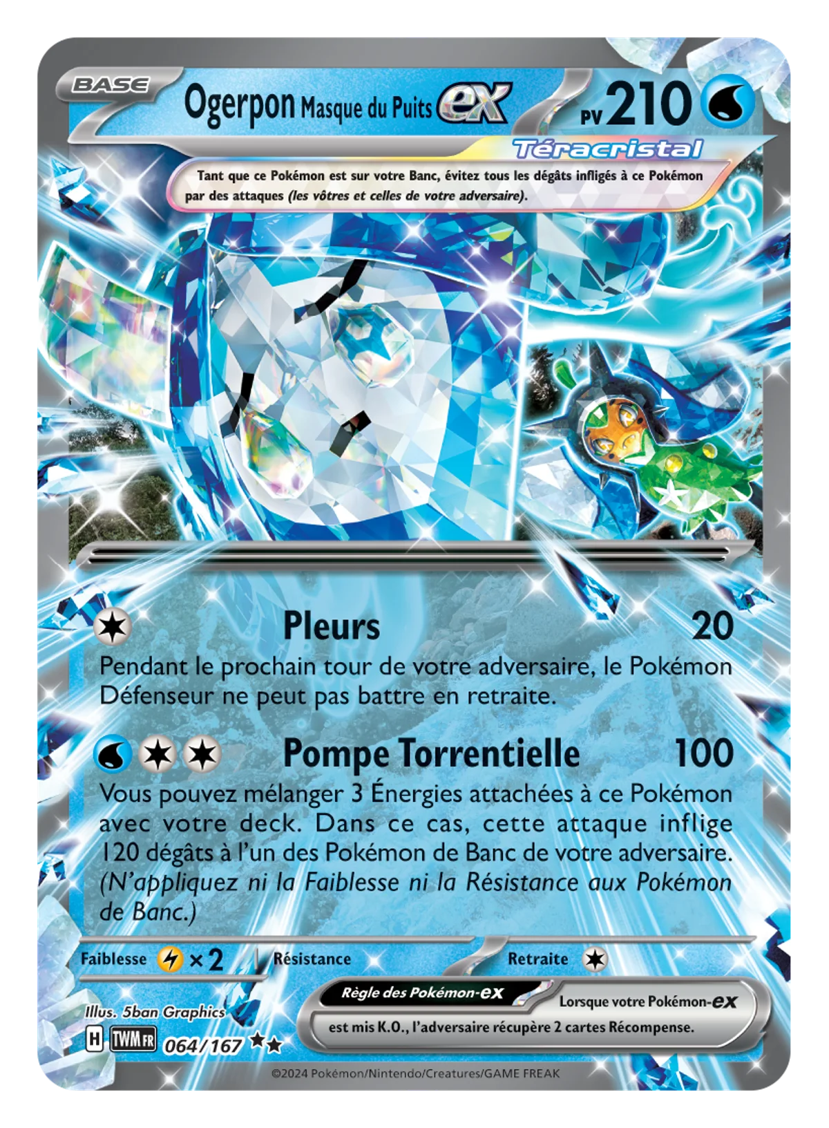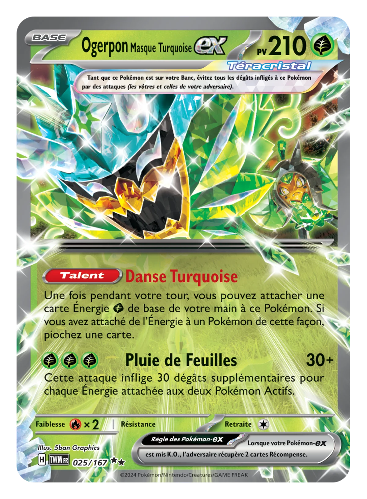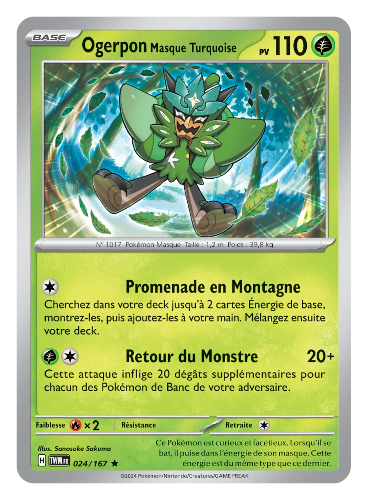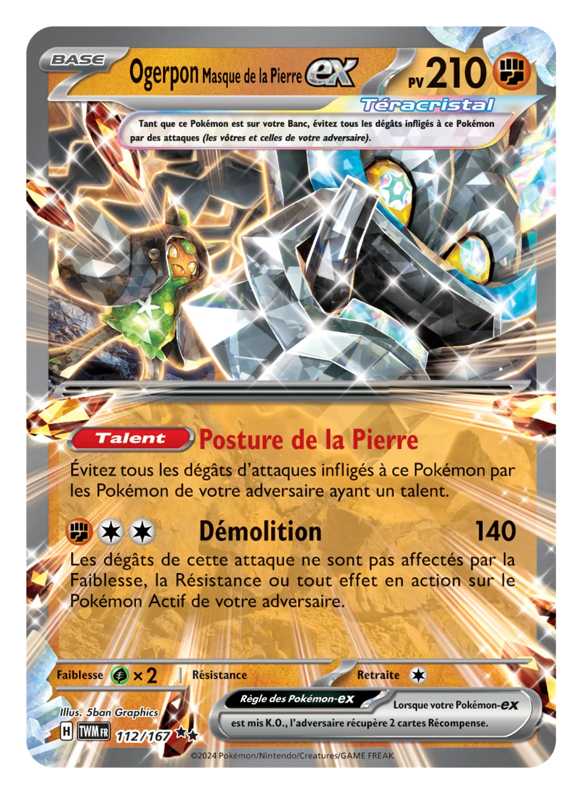 Au centre de cette extension se trouve Ogerpon, se déclinant en quatre variations ex Téracristal – Plante, Feu, Eau, et Combat – selon le masque porté. Cette polyvalence permet des stratégies de
