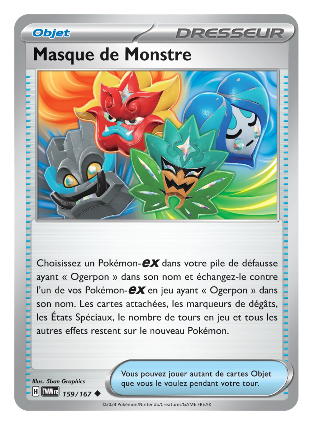 Masque du Fourneau-ex pour ensuite, grâce à la carte Masque de Monstre, échanger ce dernier contre un Ogerpon Masque du Puits-ex adapté à la tournure du jeu.