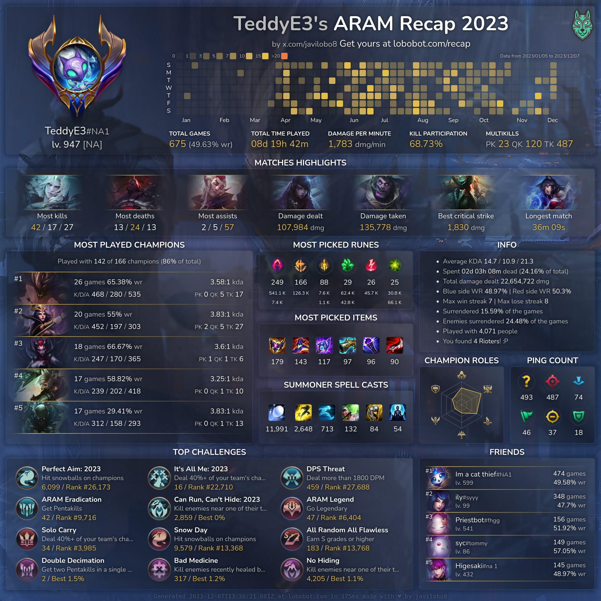 LoboBot est un site créé par Javier Bermúdez qui vous permet d’avoir un récapitulatif de votre année 2023 en Aram sur League of Legends. Pour obtenir votre récap de l’année, il vous suffit