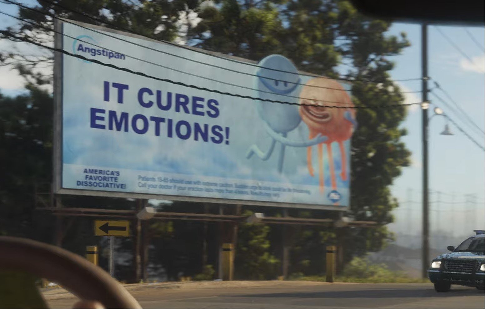 Une publicité pour une pilule appelée Angstipan parodie les médicaments contre l’angine, avec des avertissements hilarants.
