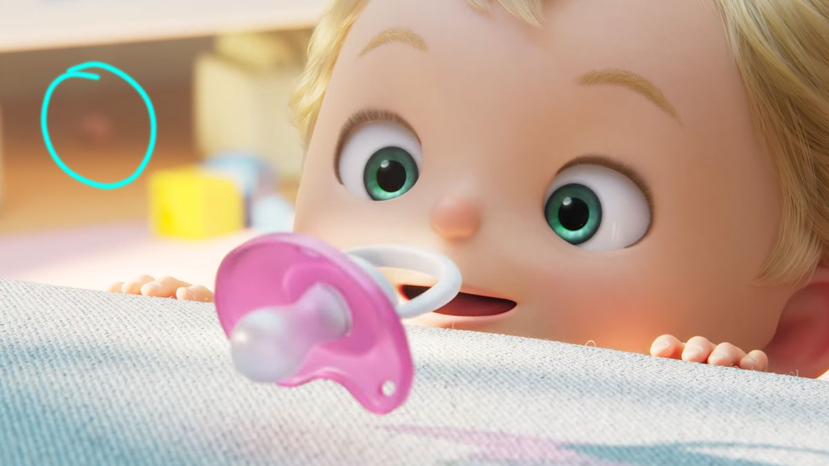 Quand la mère quitte la pièce pour ouvrir la porte, des jouets commencent à bouger tout seuls. Le hochet roule, des cubes s’animent et… la tétine du bébé s’échappe et flotte dans les airs !