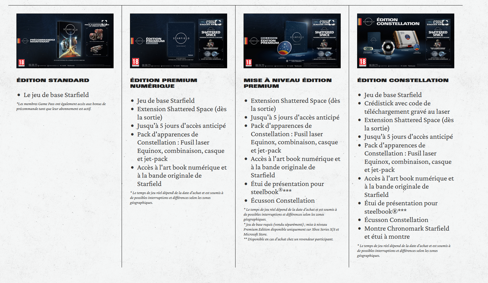 Toutes les versions au-delà de l’édition standard vous permettent de jouer en accès anticipé à Starfield. Le jeu sortant le 6 Septembre 2023, vous pourrez donc commencer à jouer dès le 1er