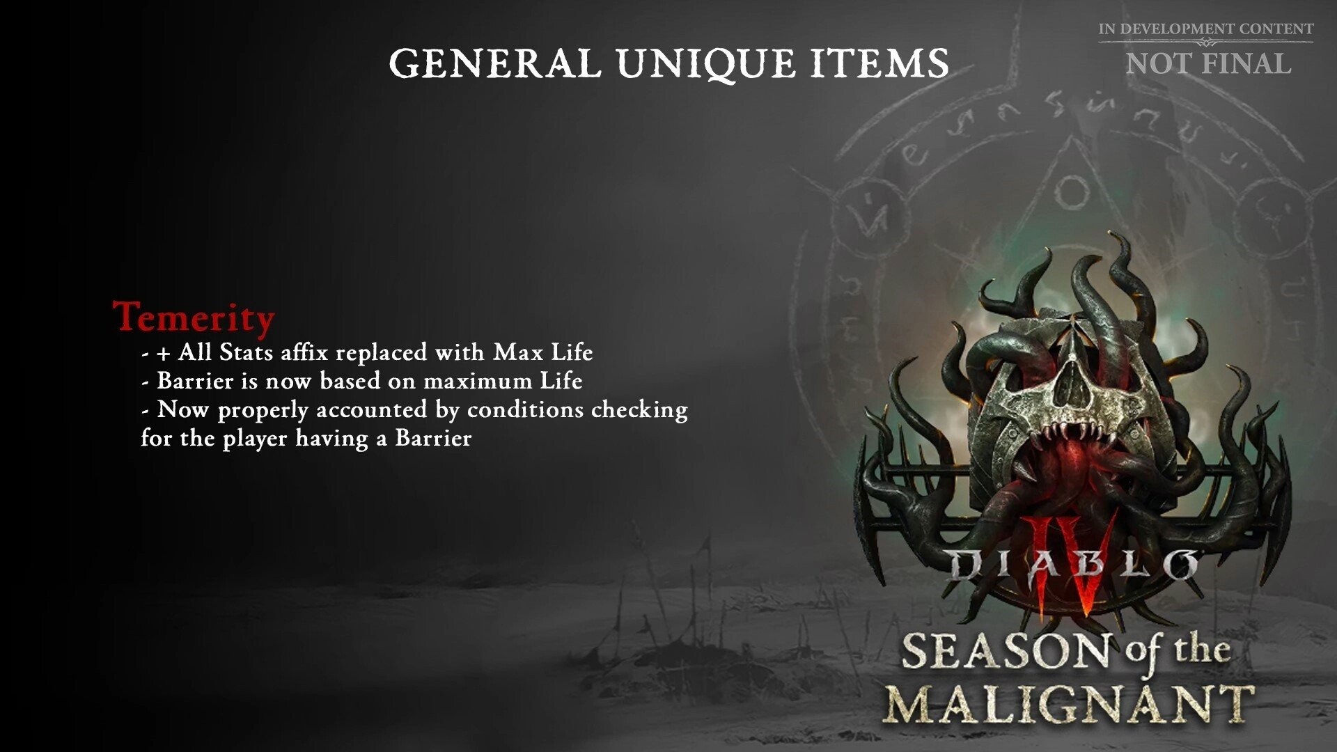 Les objets uniques seront également modifiés, remplaçant les affixes moins populaires par des bonus plus utiles. Cependant, il sera nécessaire de retrouver ces objets pour bénéficier de