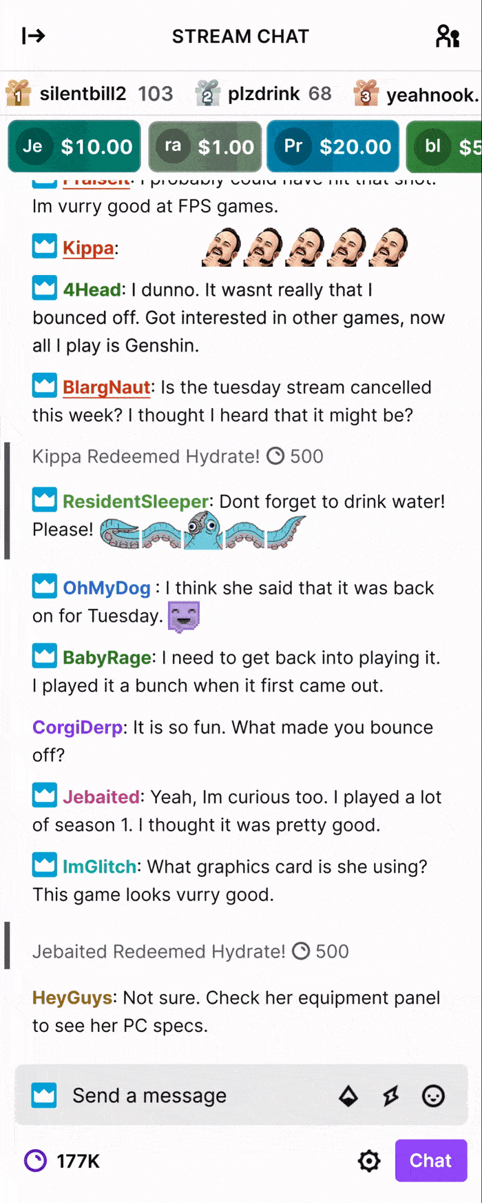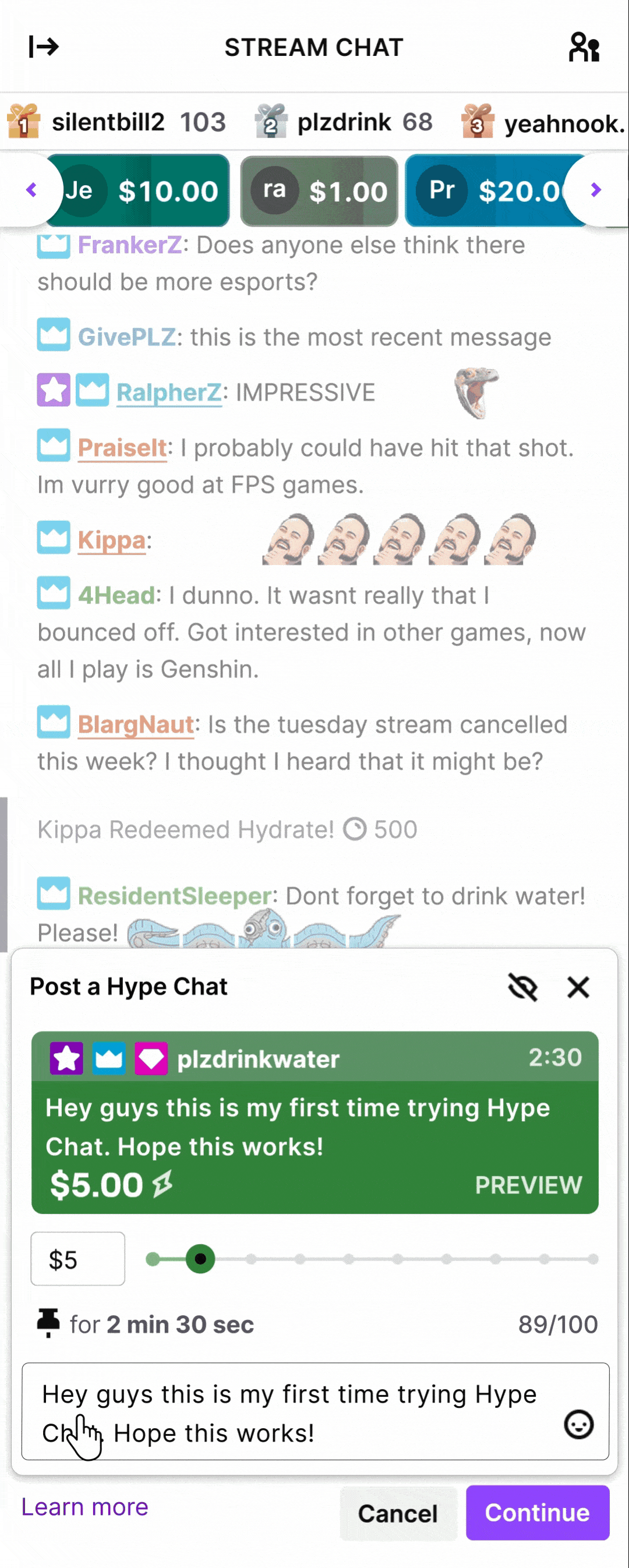 Hype Chat est un outil accessible à tous les partenaires sur Twitch. Il garantit la visibilité des messages dans des chats actifs et rapides, typiques des grandes communautés. Les messages