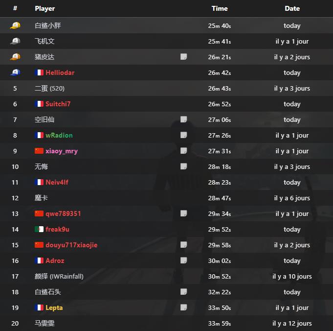 Le classement au 10 juin 2023, comme vous pouvez le voir, 5 Français figurent dans le top 20 – source : Speedrun!com