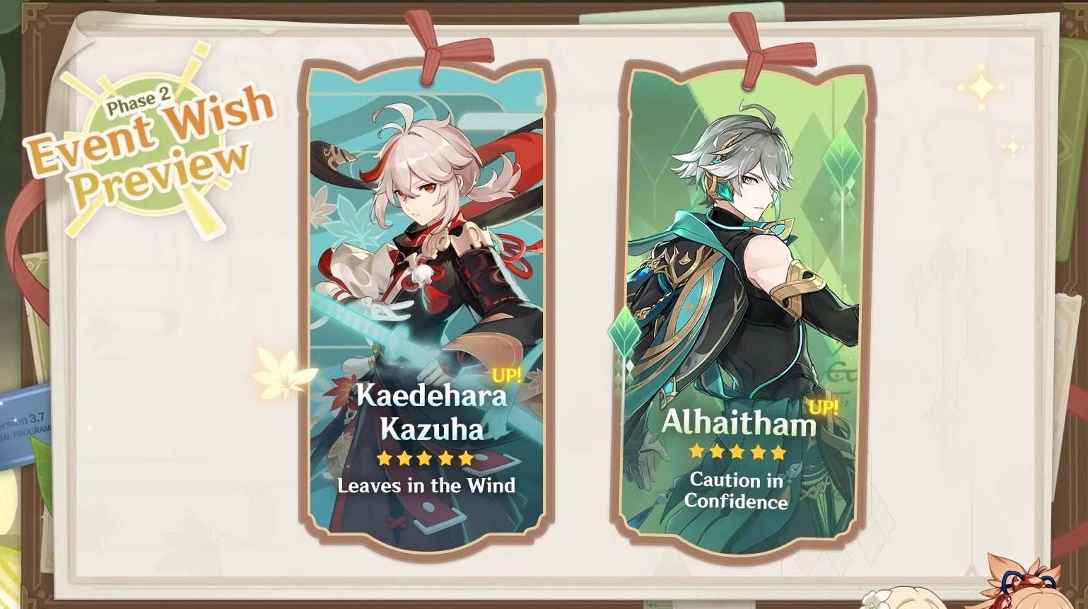 Kazuha et Alhaitham seront les deux 5 étoiles mis en avant dans la seconde phase des bannières du patch 3.7  à partir du mardi 13 juin (crédits : miHoYo)