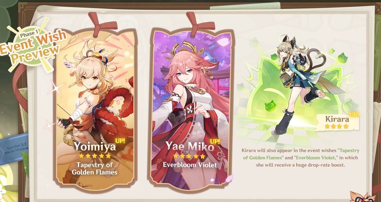 Yoimiya et Yae Miko seront les deux personnages 5 étoiles mis en avant dans la première phase des bannières du patch 3.7 qui sortiront le 24 mai. Kirara sera présente dans les deux bannières (crédits