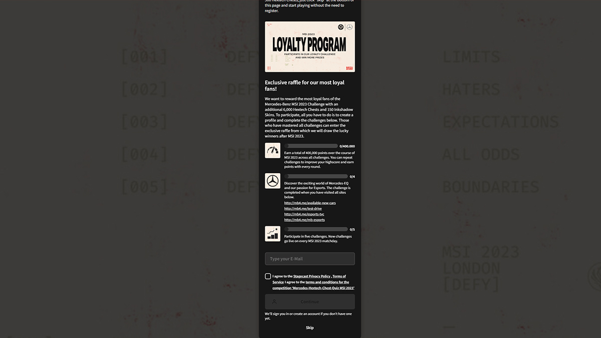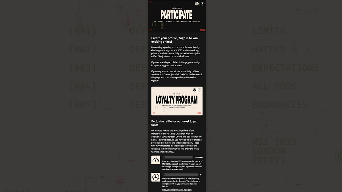 Les défis de fidélité : Mercedes-Benz souhaite récompenser les fans les plus fidèles du MSI 2023 Challenge avec 6 000 coffres Hextech supplémentaires et 150 skins Inkshadow.